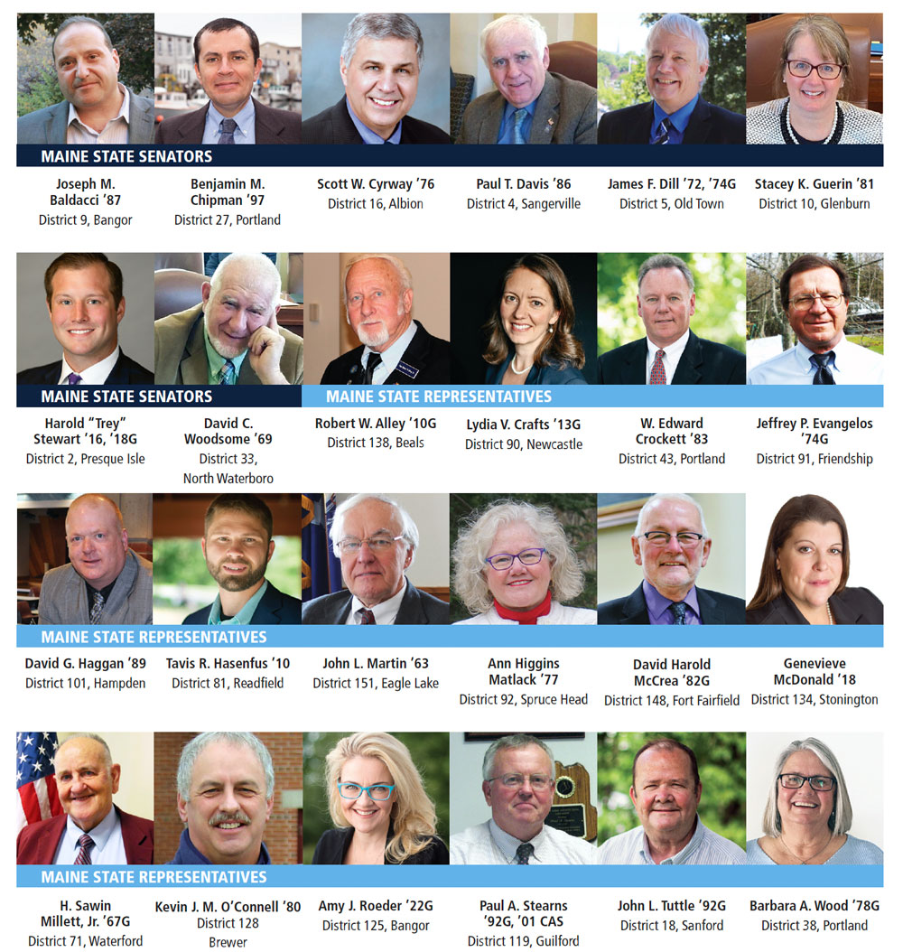 The current Maine State Legislature has a strong representation of Black Bear alumni among its members: eight senators and 17 representatives, including House Majority Leader Michelle Dunphy `88, `96.