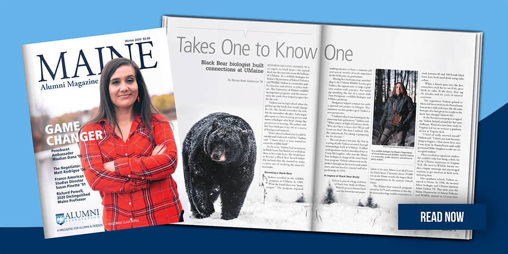 Read about the work of Penobscot Ambassador Maulian Dana ’06, Black Bear biologist Jennifer Vashon ’93, Matt Rodrigue’s ’04 role in addressing Puerto Rico’s debt crisis, class notes, and more.