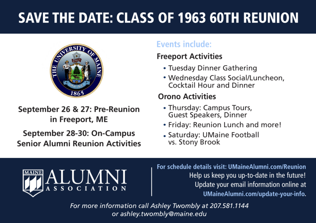 Save the Dates! September 26 & 27:Pre-reunion in Freeport, Maine September 28-30: On-campus Senior Alumni Reunion Activities Dear Classmates, After several years of Covid-aborted mini class reunions we are now looking at our 60th. Our reunion committee has planned events in Freeport and Orono that will give us an opportunity to revisit old times, connect with…