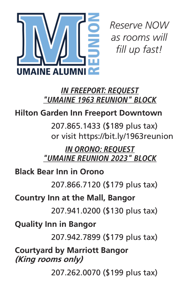 Hello, classmates, My hope was to give you “great detail” of the plans for our 60th Reunion in 2023! At the time this column was due “great detail” was just not available. However, by the time you read this column, that information will be on the UMaine Alumni Association website. If you have any questions,…