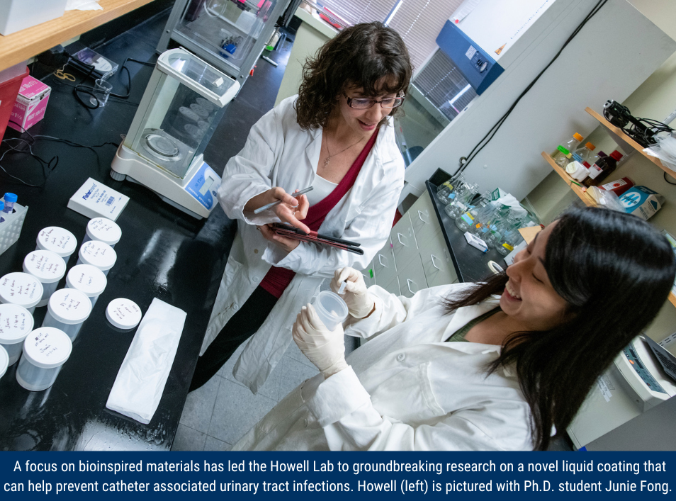 Caitlin Howell: “The work in my lab is focused on bioinspired materials and has a lot of applications in both medicine and industry. We look to see how nature solves problems, and then take those ideas and try to apply them to human challenges. In particular, we work on developing materials and surfaces that can control biology, and can tell us information about cells or viruses or bacteria.